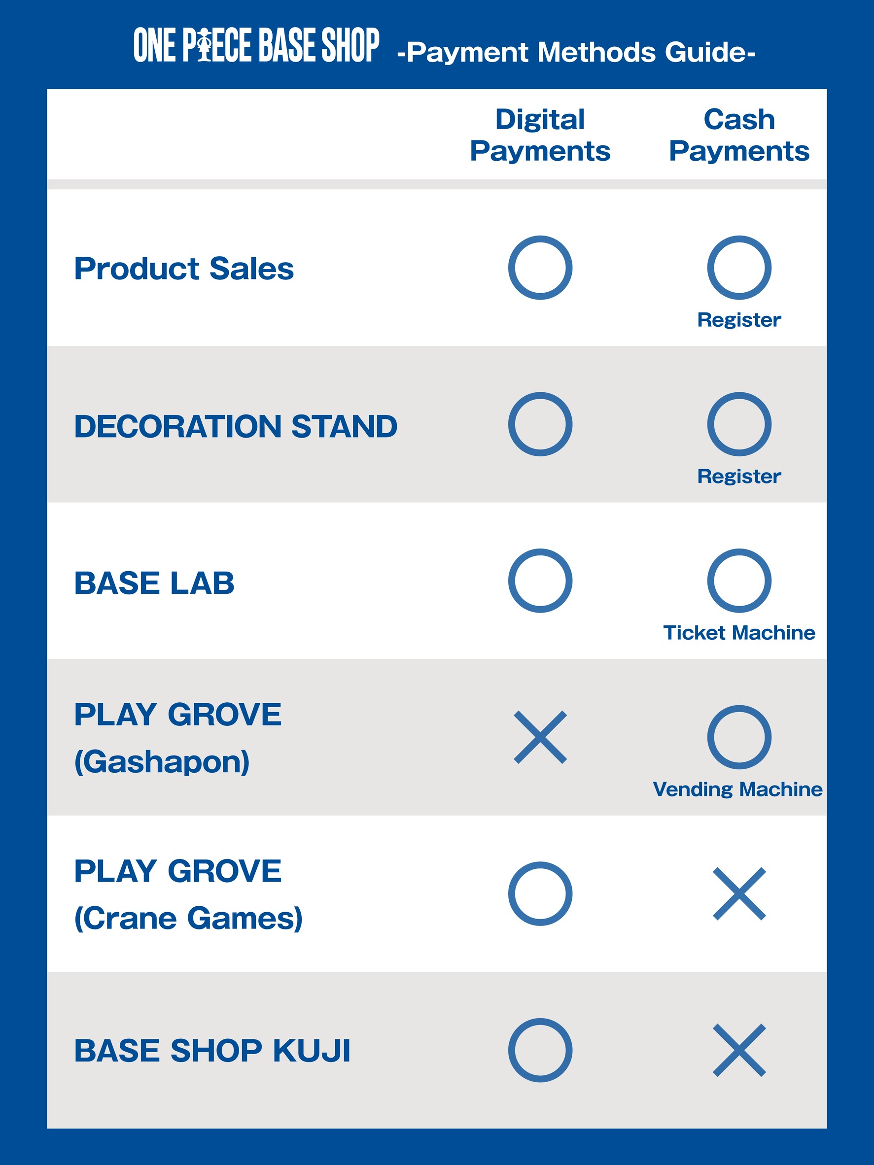 At ONE PIECE BASE SHOP, available payment methods differ depending on the area.